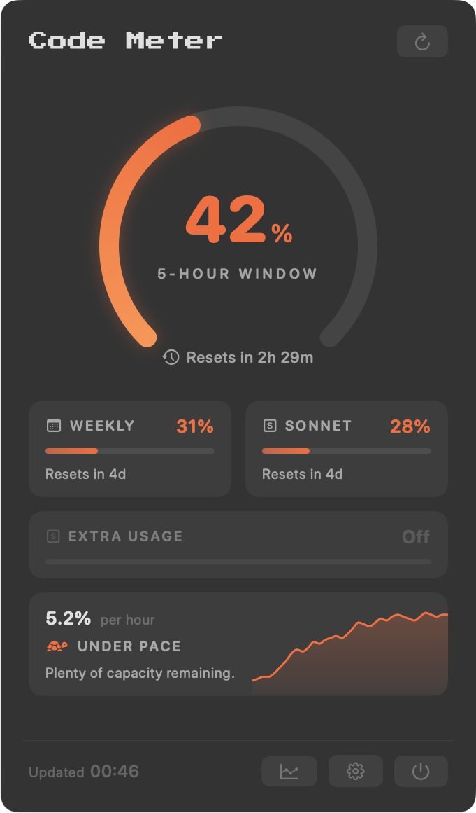 Claude and the Anthropic name are trademarks of Anthropic, PBC. Code Meter uses Anthropic's public usage API solely to display your own account data to you.